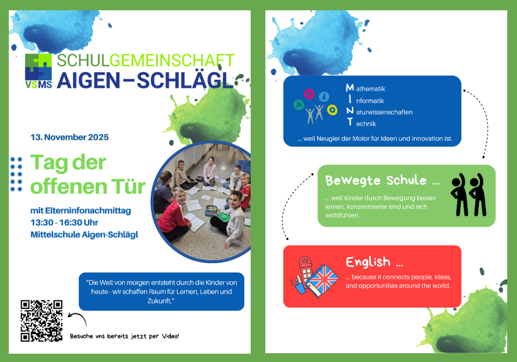 Unser Tag der offenen Tür mit anschließendem Elterninformationsnachmittag findet heuer am 13.11.2025 ab 13:30 Uhr statt.