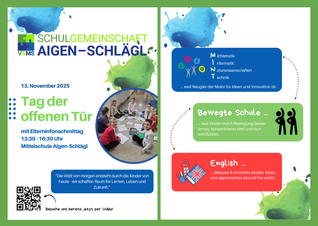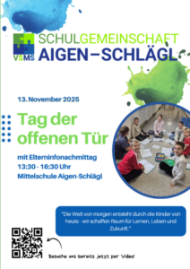 Unser Tag der offenen Tür mit anschließendem Elterninformationsnachmittag findet heuer am 13.11.2025 ab 13:30 Uhr statt.